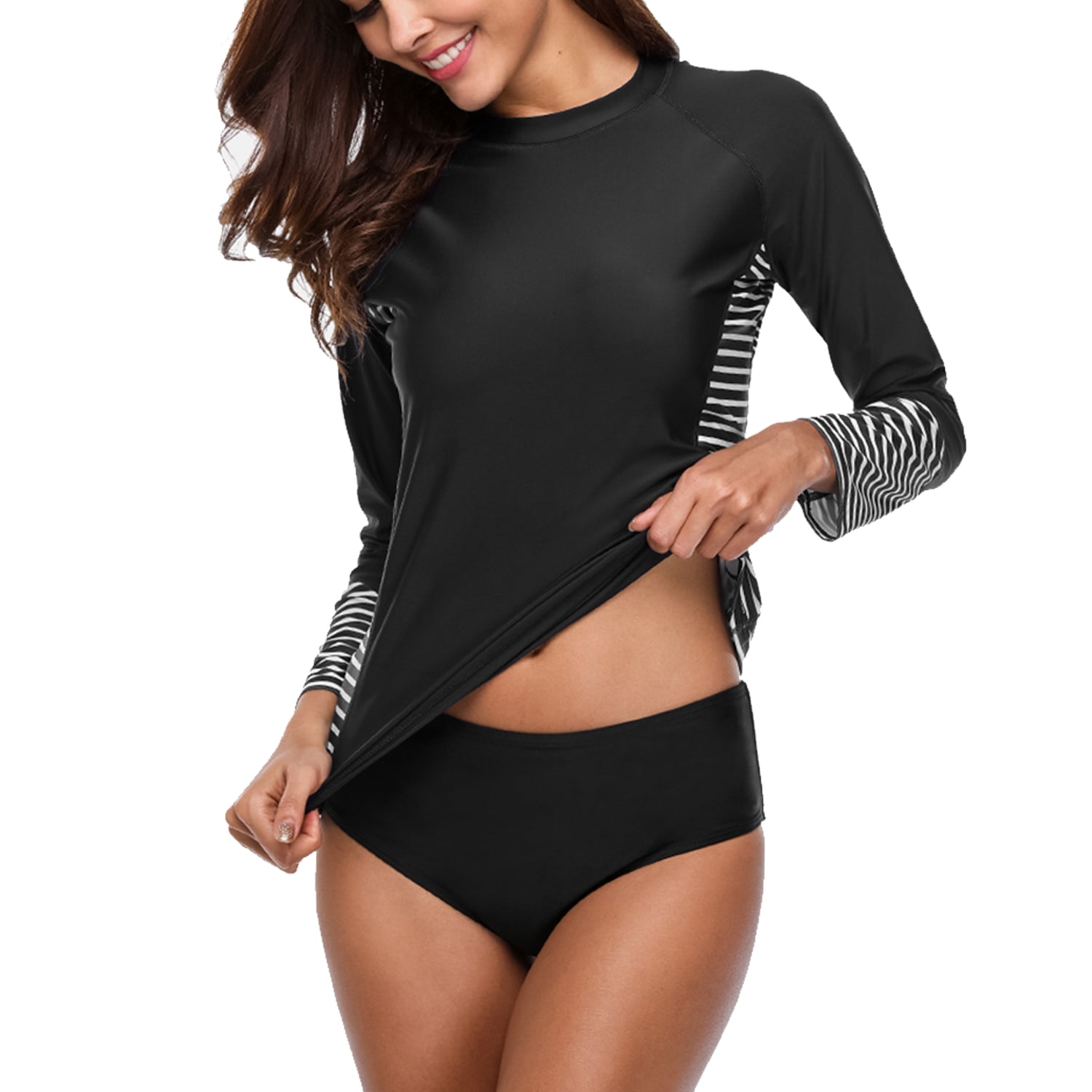 Attraco Women S Long Sleeve Rash Guard Stripe Splicing Swimwear Upf 51 Running Swimming Shirt Walmart Com